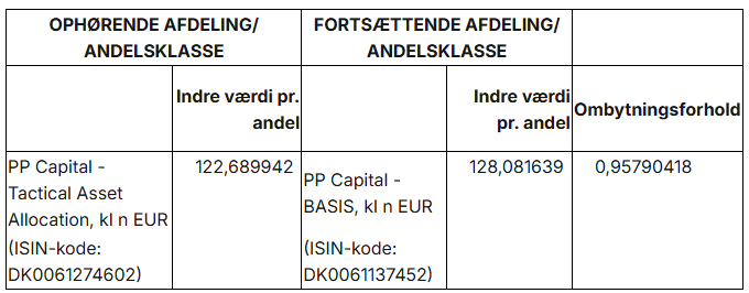 I fortsættelse af børsmeddelelse af 2. december 2025 skal det for de nedenfor nævnte afdelinger/andelsklasser oplyses, at fusionen vil blive gennemført på baggrund af de anførte indre værdier og heraf beregnede ombytningsforhold.